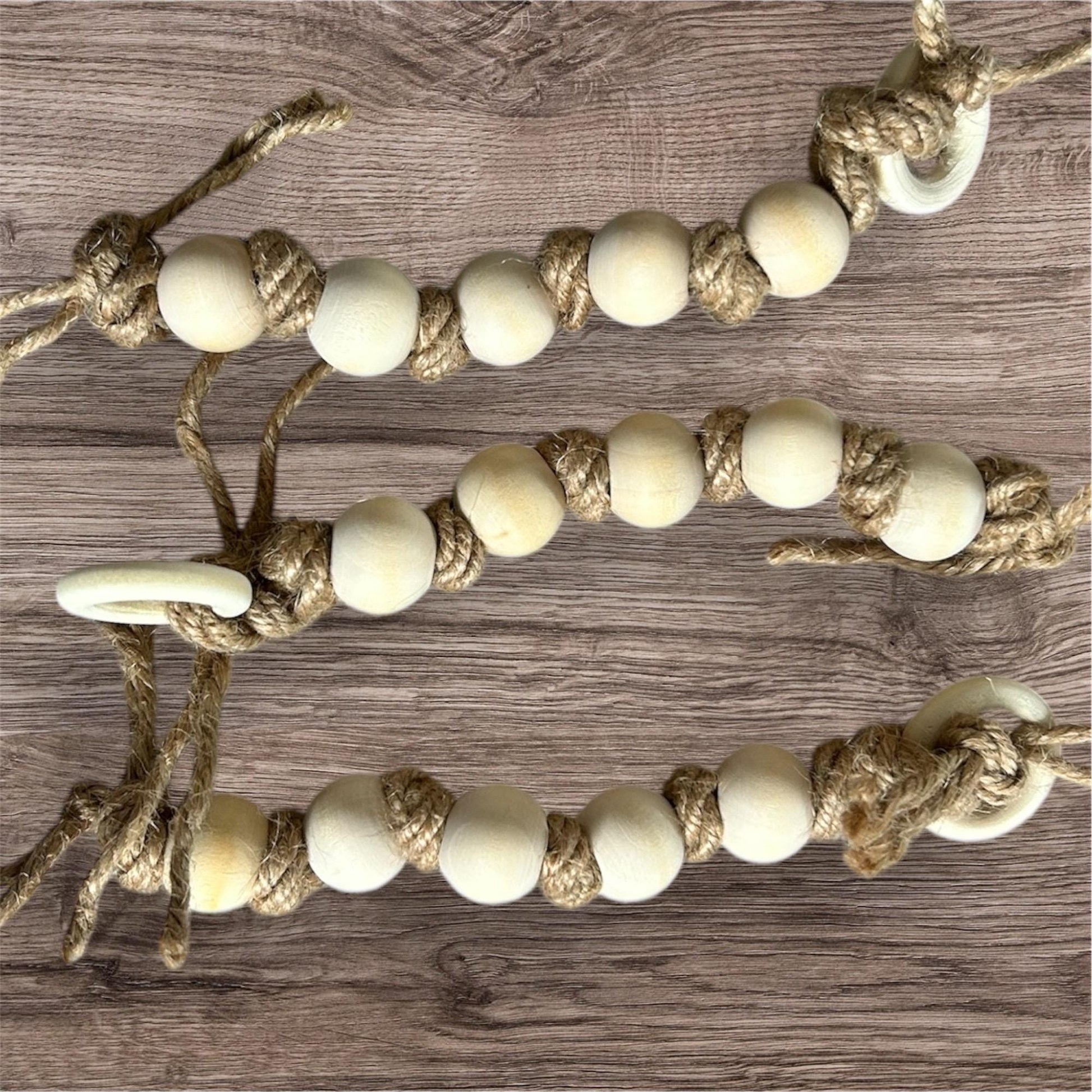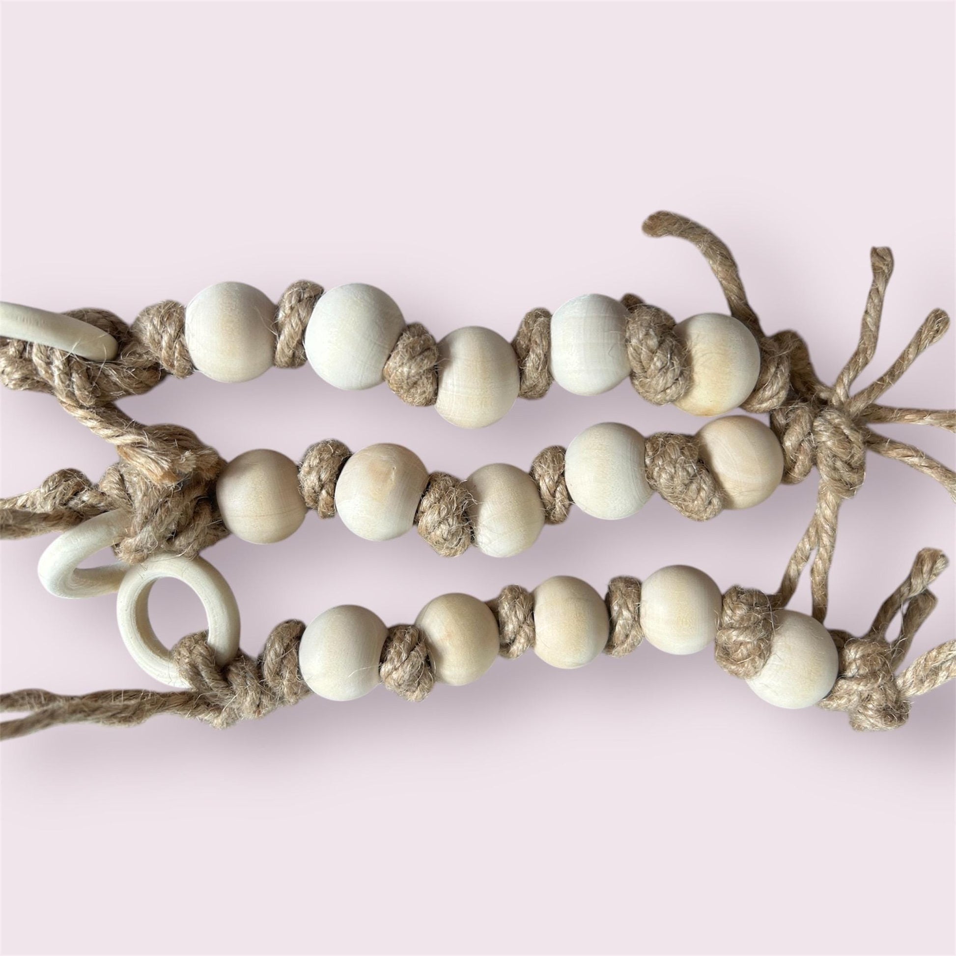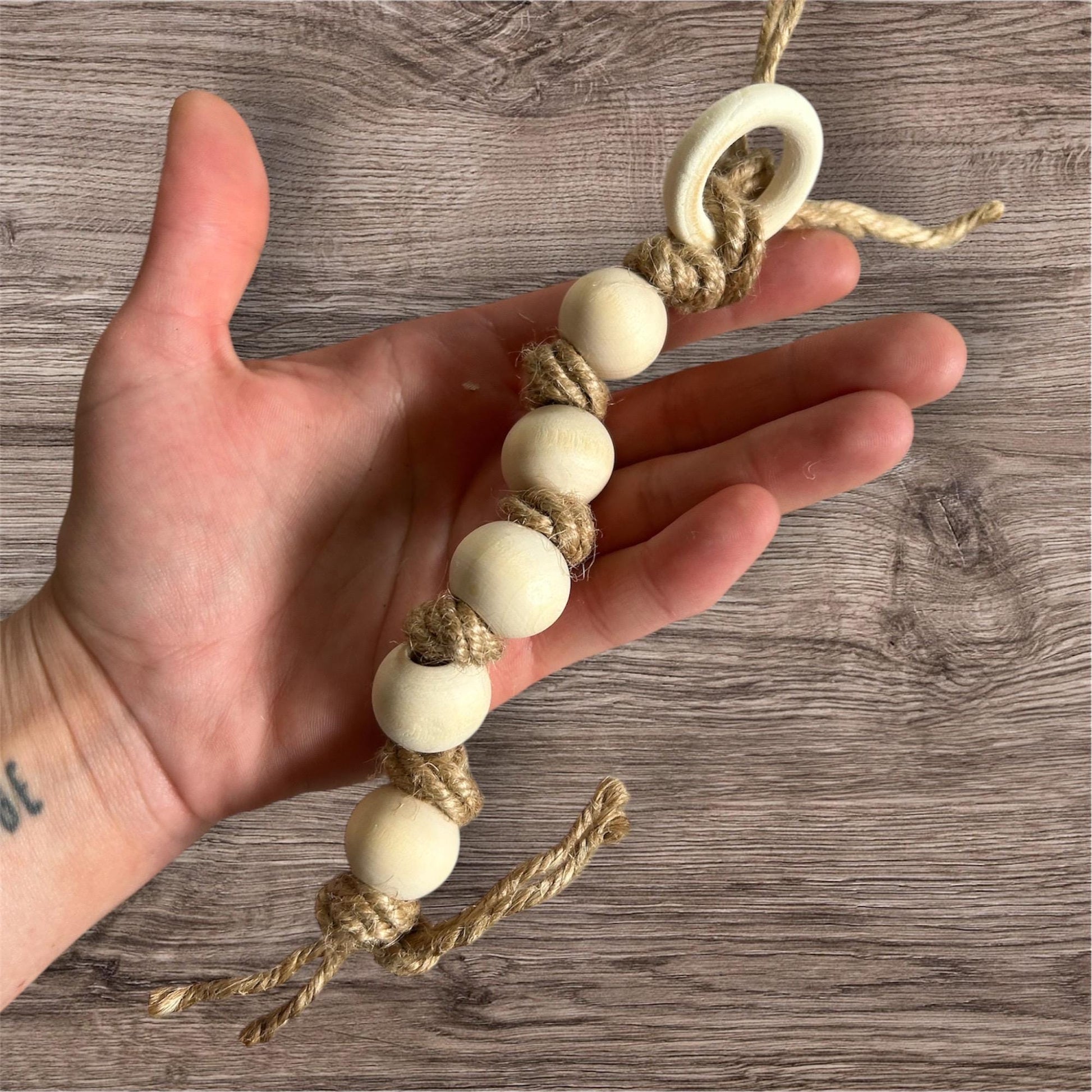 these adorable foot toys, feature five natural wooden beads, knotted for durability with thick natural jute string. everything is attached and ready to be played with, stomped on, and pecked at.