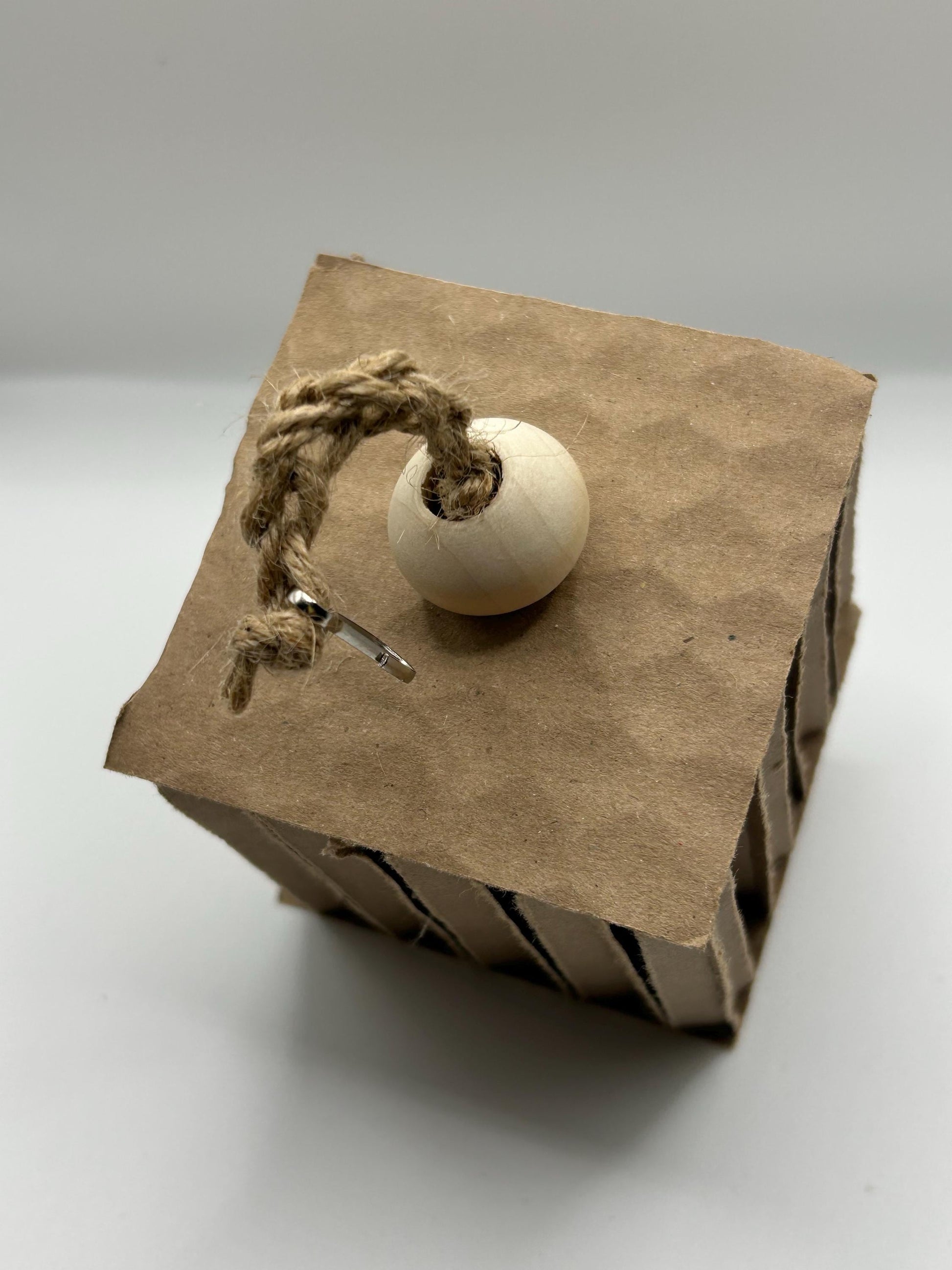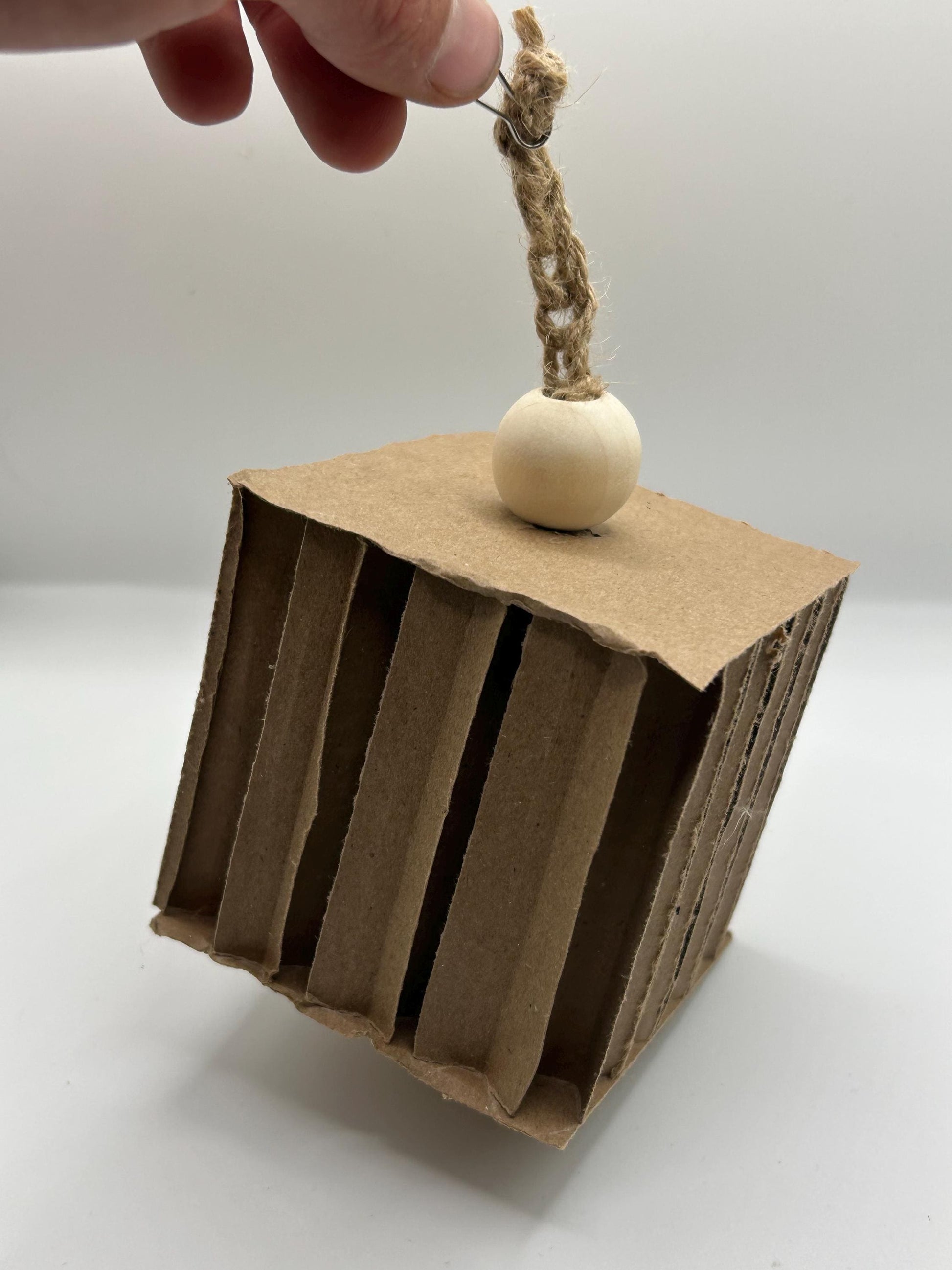 Simple yet effective, cardboard cube toy for small animals. Watch them for hours as the chew and shred the cardboard. Natural wood beads added for additional fun. Made with just jute string.