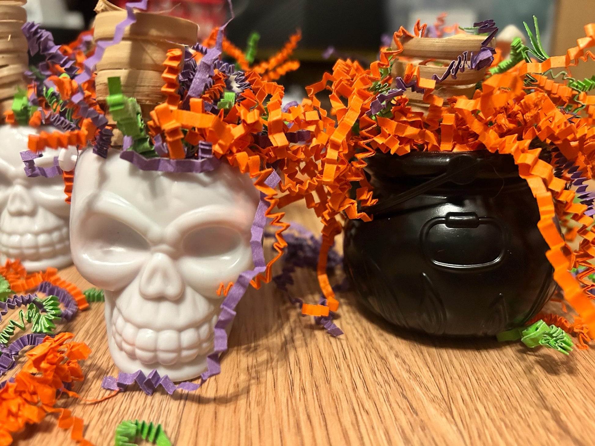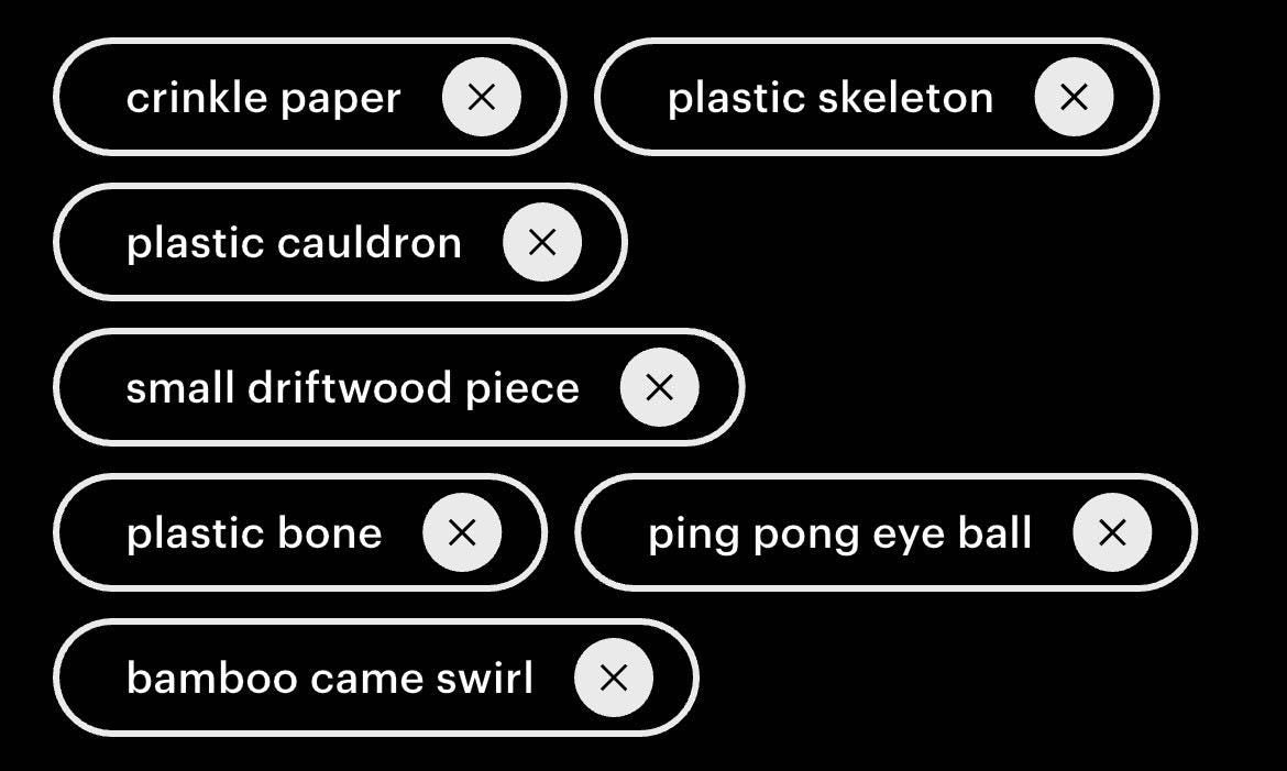 plastic bone, small piece of driftwood, eyeball pingpong ball, bamboo cane, crinkle paper