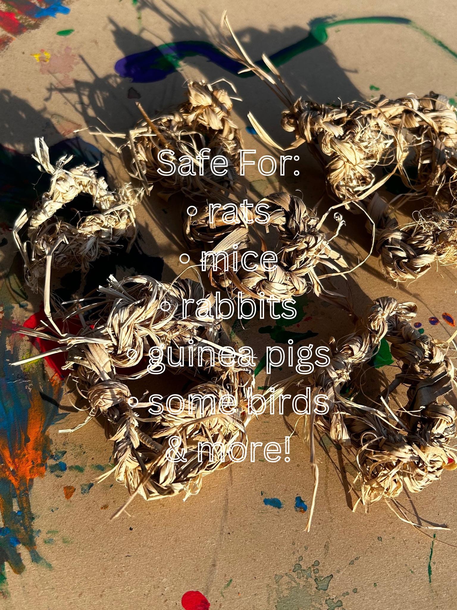 These rings are made with natural raffia and your pet in mind. Hand-crafted to maximize your small animal's enjoyment! I weave and crochet long, and again, completely natural palm leaf fibers (raffia) into an enrichment toy! These rings are durable and could easily be hung up to extend it's lifetime; you should always remove contaminated toys from your animal's cage.