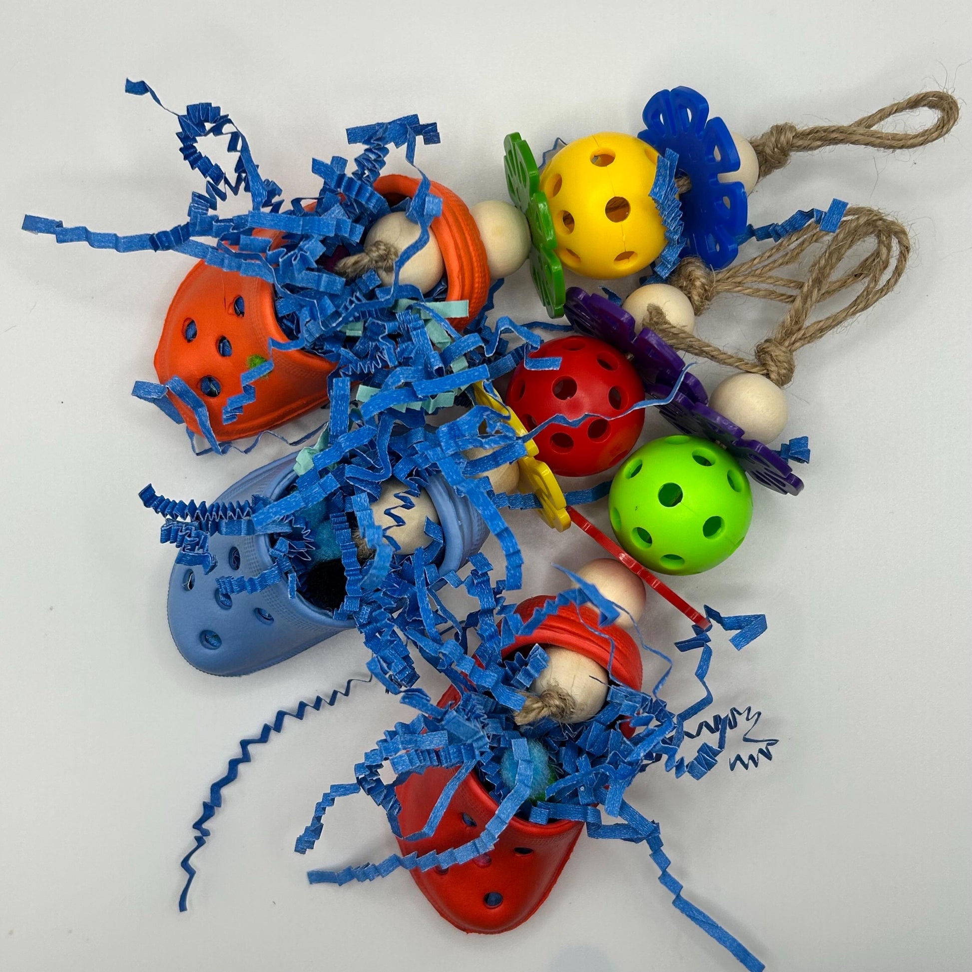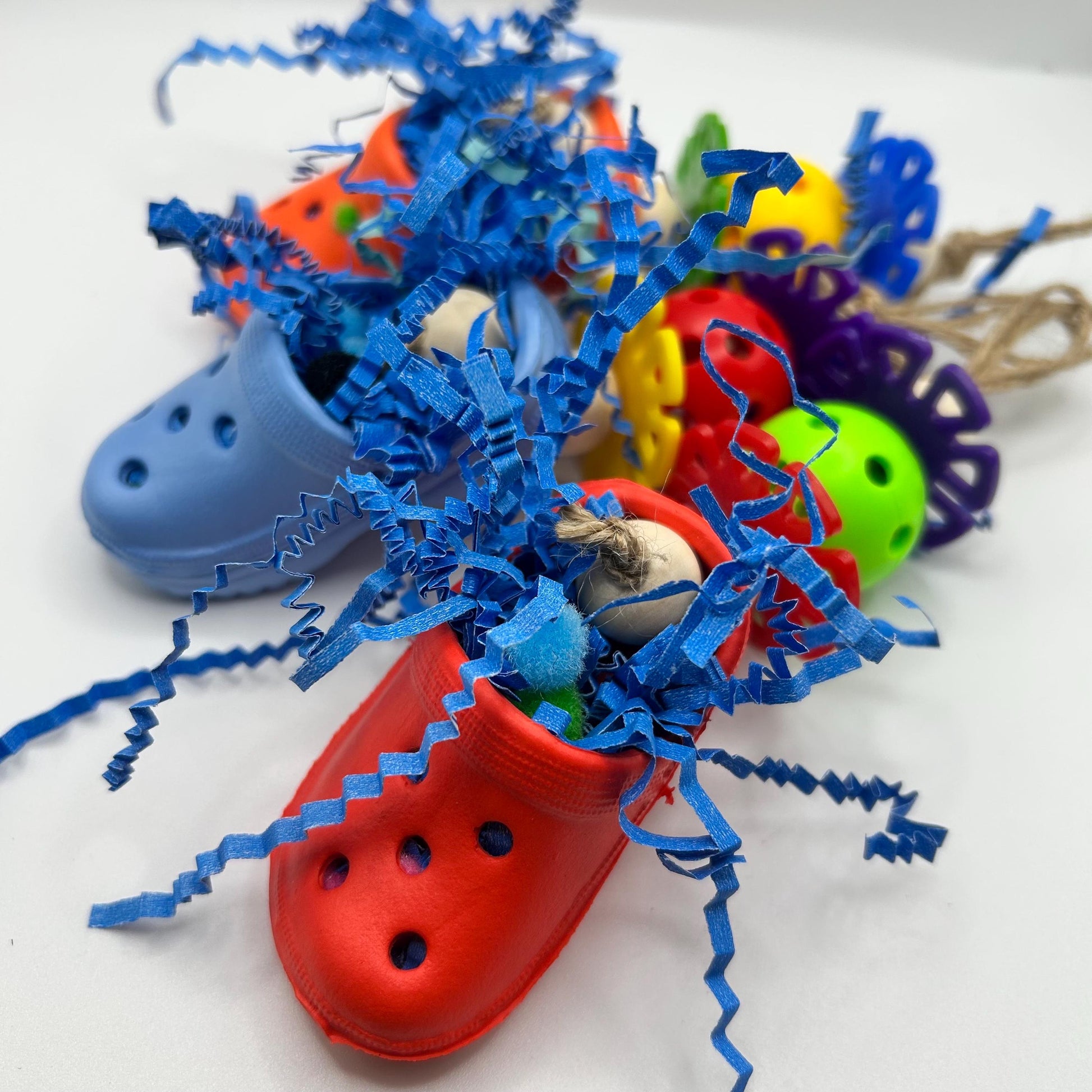 - foraging shoe: with crinkle paper and mini pompoms